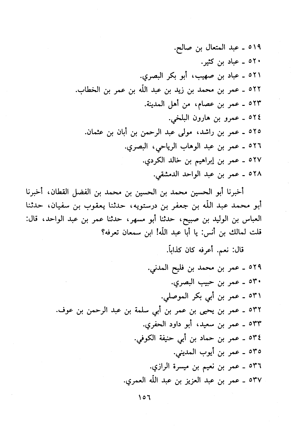 أخبرنا أبو الحسين محمد بن الحسين بن محمد بن الفضل القطان، أخبرنا أبو محمد عبد الله بن جعفر بن درستويه، حدثنا يعقوب بن سفيان، حدثنا العباس بن الوليد بن صبيح، حدثنا أبو مسهر، حدثنا عمر بن عبد الواحد، قال قلت لمالك بن أنس يا أبا عبد الله ابن سمعان تعرفه؟