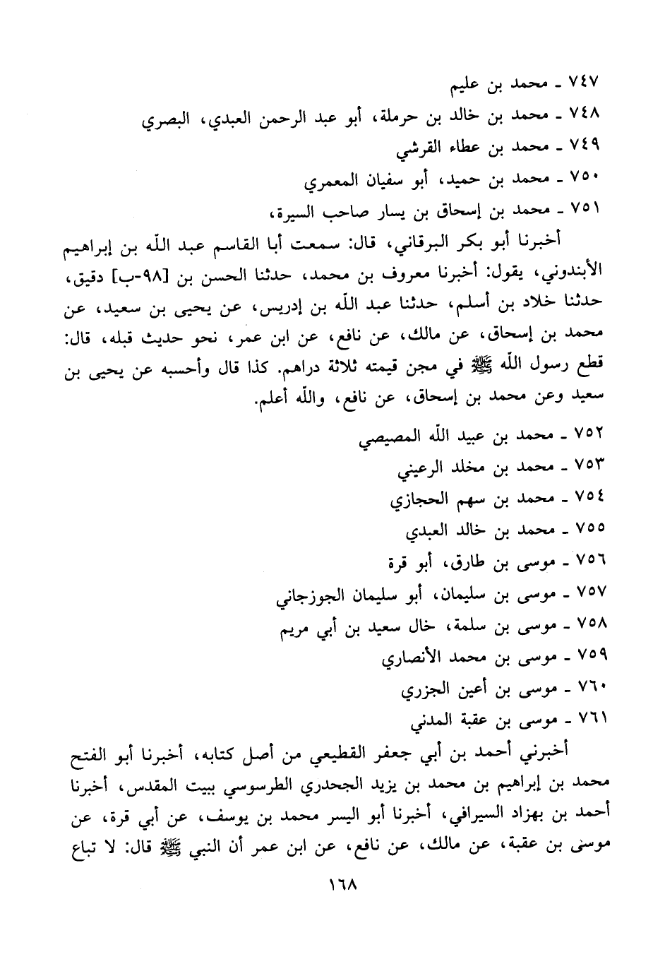 أخبرني أحمد بن أبي جعفر القطيعي من أصل كتابه، أخبرنا أبو الفتح محمد بن إبراهيم بن محمد بن يزيد الجحدري الطرسوسي ببيت المقدس، أخبرنا أحمد بن بهزاد السيرافي، أخبرنا أبو اليسر محمد بن يوسف، عن أبي قرة، عن موسى بن عقبة، عن مالك، عن نافع، عن ابن عمر أن النبي صلى الله عليه وسلم قال لا تباع
