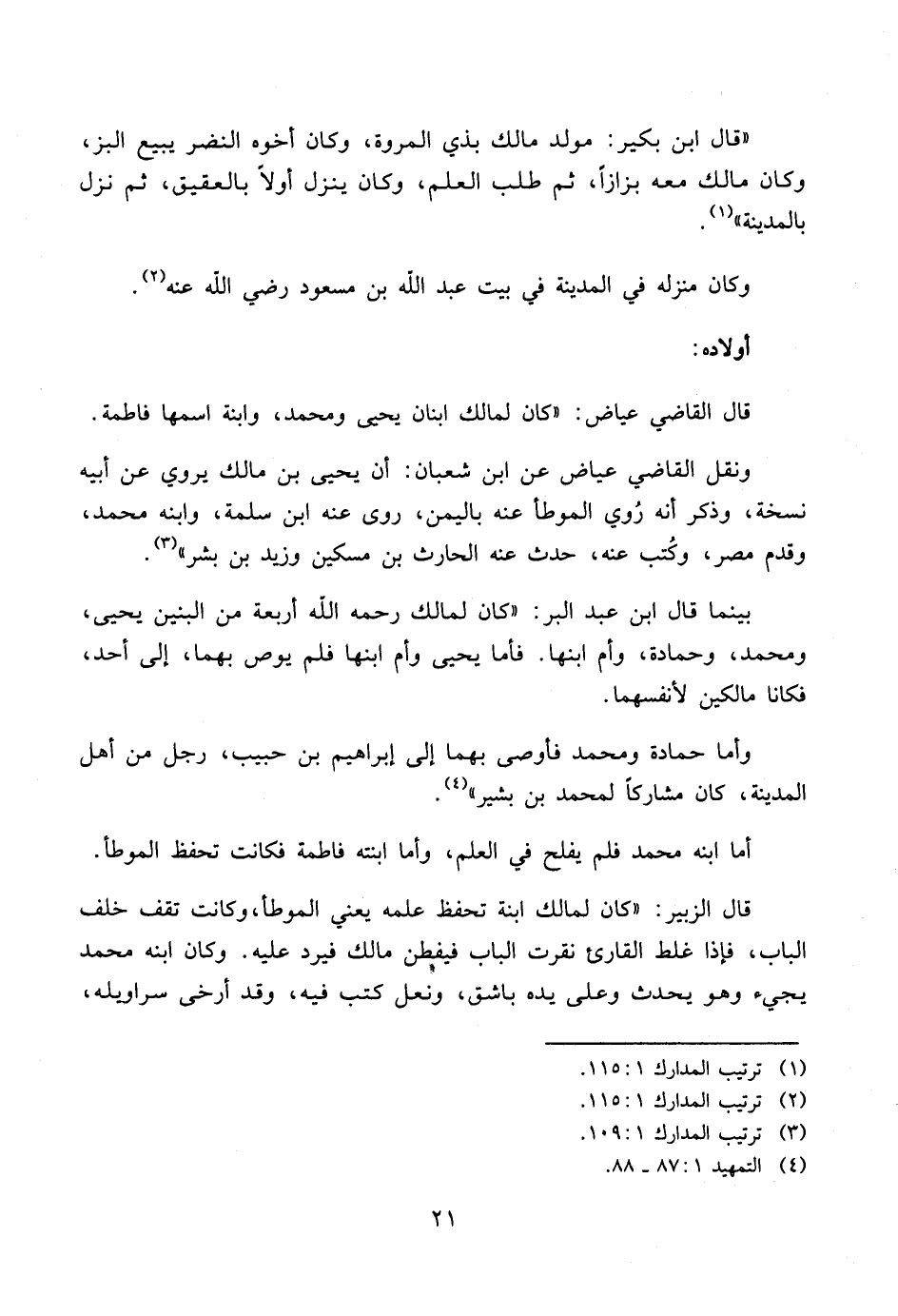 بينما قال ابن عبد البر: «كان لمالك رحمه الله أربعة من البنين يحيى، ومحمد، وحمادة، وأم ابنها. فأما يحيى وأم ابنها فلم يوص بهما، إلى أحد، فكانا مالكين لأنفسهما.
