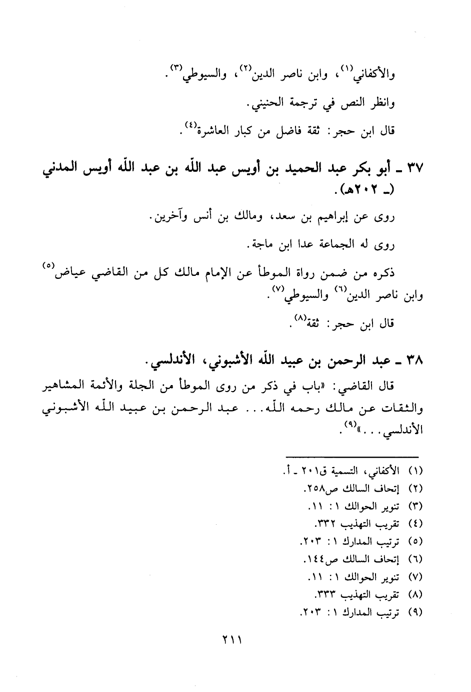 قال القاضي: «باب في ذكر من روى الموطأ من الجلة والأئمة المشاهير والثقات عن مالك رحمه الله ... عبد الرحمن بن عبيد الله الأشبوني الأندلسي ... ».