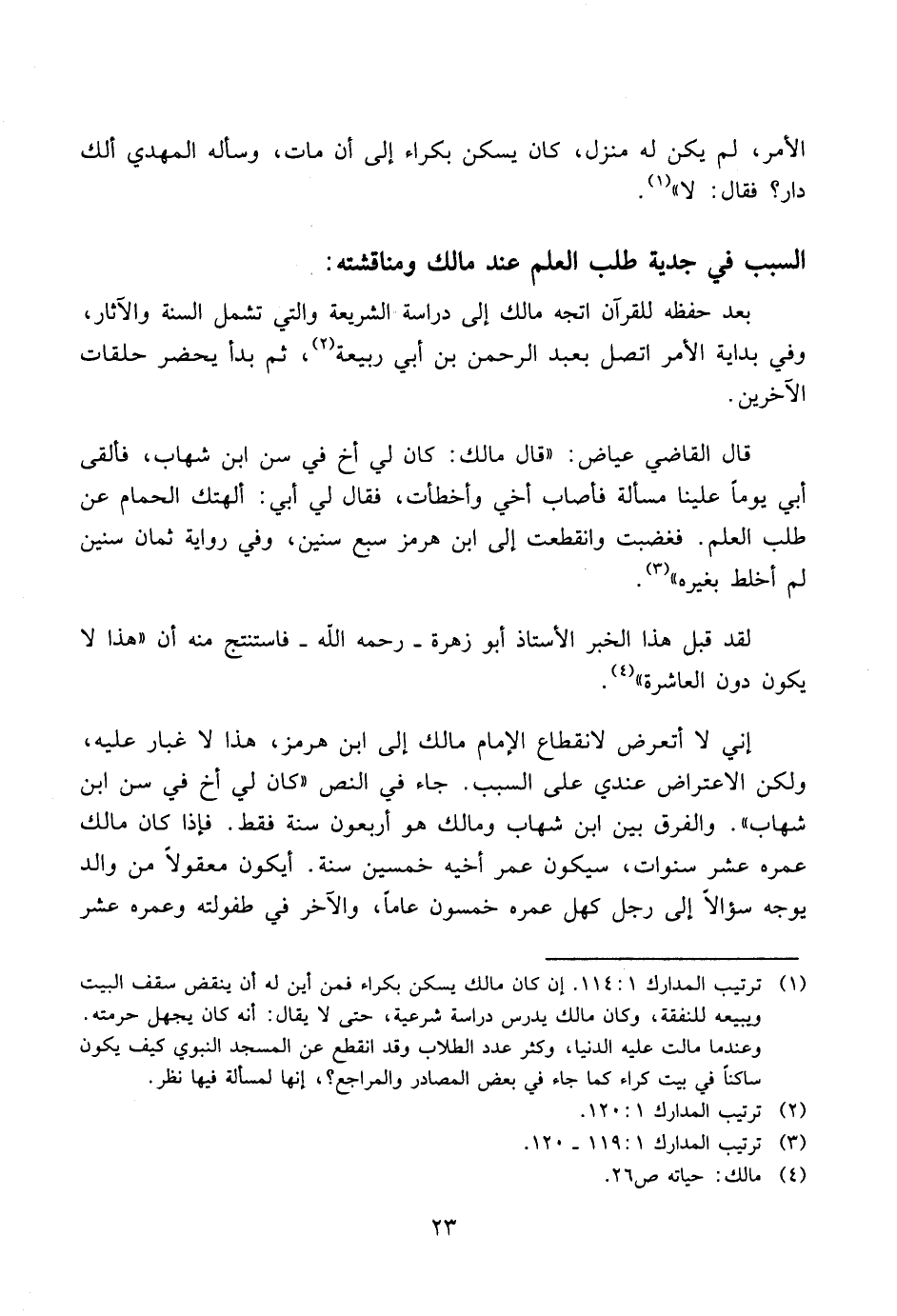 إني لا أتعرض لانقطاع الإمام مالك إلى ابن هرمز، هذا لا غبار عليه، ولكن الاعتراض عندي على السبب. جاء في النص «كان لي أخ في سن ابن شهاب». والفرق بين ابن شهاب ومالك هو أربعون سنة فقط. فإذا كان مالك عمره عشر سنوات، سيكون عمر أخيه خمسين سنة. أيكون معقولاً من والد يوجه سؤالاً إلى رجل كهل عمره خمسون عاماً، والآخر في طفولته وعمره عشر