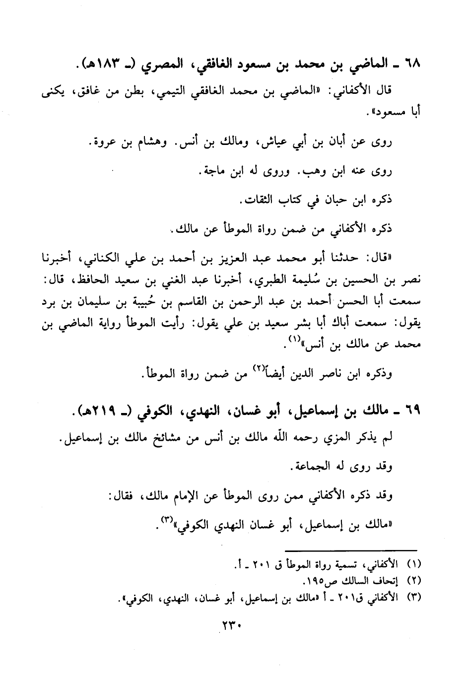 «قال: حدثنا أبو محمد عبد العزيز بن أحمد بن علي الكناني، أخبرنا نصر بن الحسين بن سُليمة الطبري، أخبرنا عبد الغني بن سعيد الحافظ، قال: سمعت أبا الحسن أحمد بن عبد الرحمن بن القاسم بن حُبيبة بن سليمان بن برد يقول: سمعت أباك أبا بشر سعيد بن علي يقول: رأيت الموطأ رواية الماضي بن محمد عن مالك بن أنس».