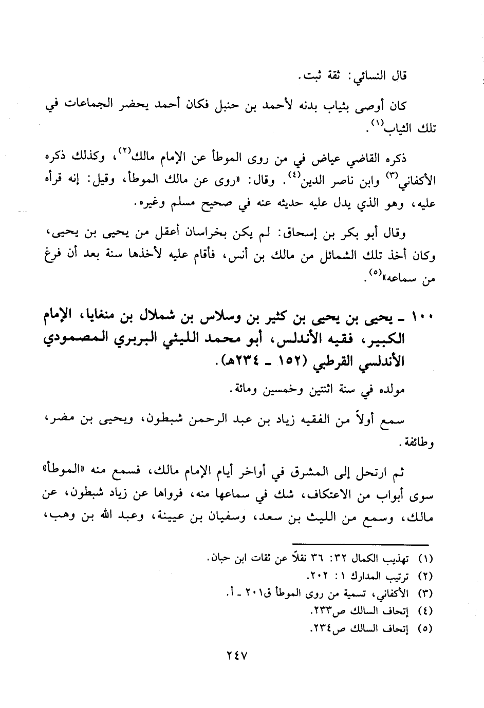 ١٠٠ - يحيى بن يحيى بن كثير بن وسلاس بن شملال بن منغايا، الإمام الكبير، فقيه الأندلس، أبو محمد الليثي البربري المصمودي الأندلسي القرطبي (١٥٢ - ٢٣٤هـ).