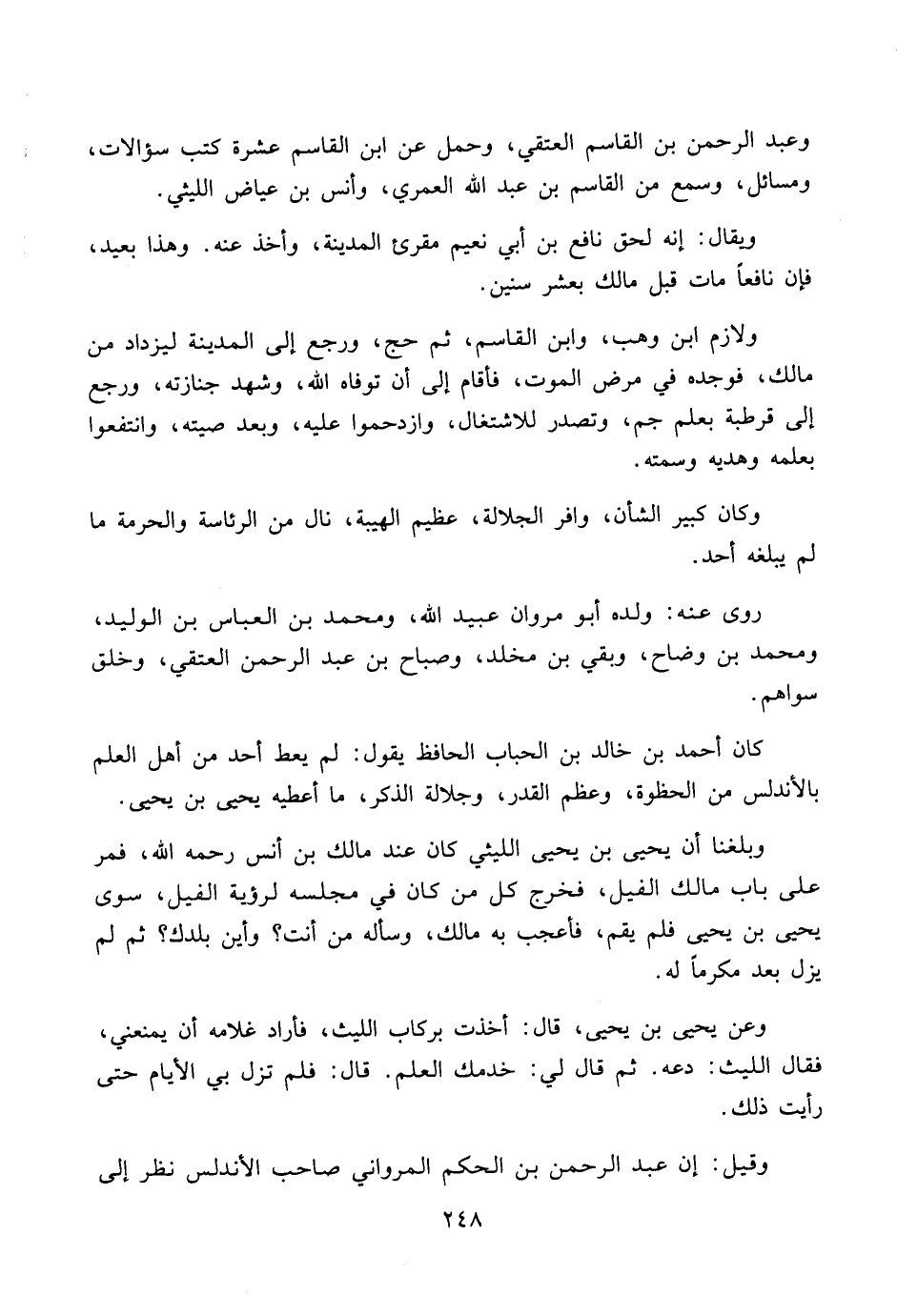 ولازم ابن وهب، وابن القاسم، ثم حج، ورجع إلى المدينة ليزداد من مالك، فوجده في مرض الموت، فأقام إلى أن توفاه الله، وشهد جنازته، ورجع إلى قرطبة بعلم جم، وتصدر للاشتغال، وازدحموا عليه، وبعد صيته، وانتفعوا بعلمه وهديه وسمته.