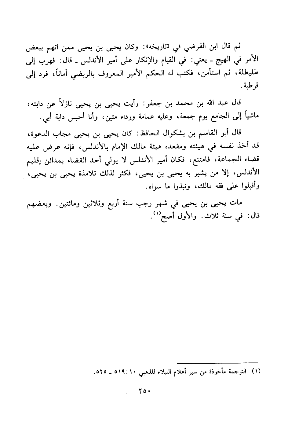ثم قال ابن الفرضي في «تاريخه»: وكان يحيى بن يحيى ممن اتهم ببعض الأمر في الهيج - يعني: في القيام والإنكار على أمير الأندلس - قال: فهرب إلى طليطلة، ثم استأمن، فكتب له الحكم الأمير المعروف بالربضي أماناً، فرد إلى قرطبة.
