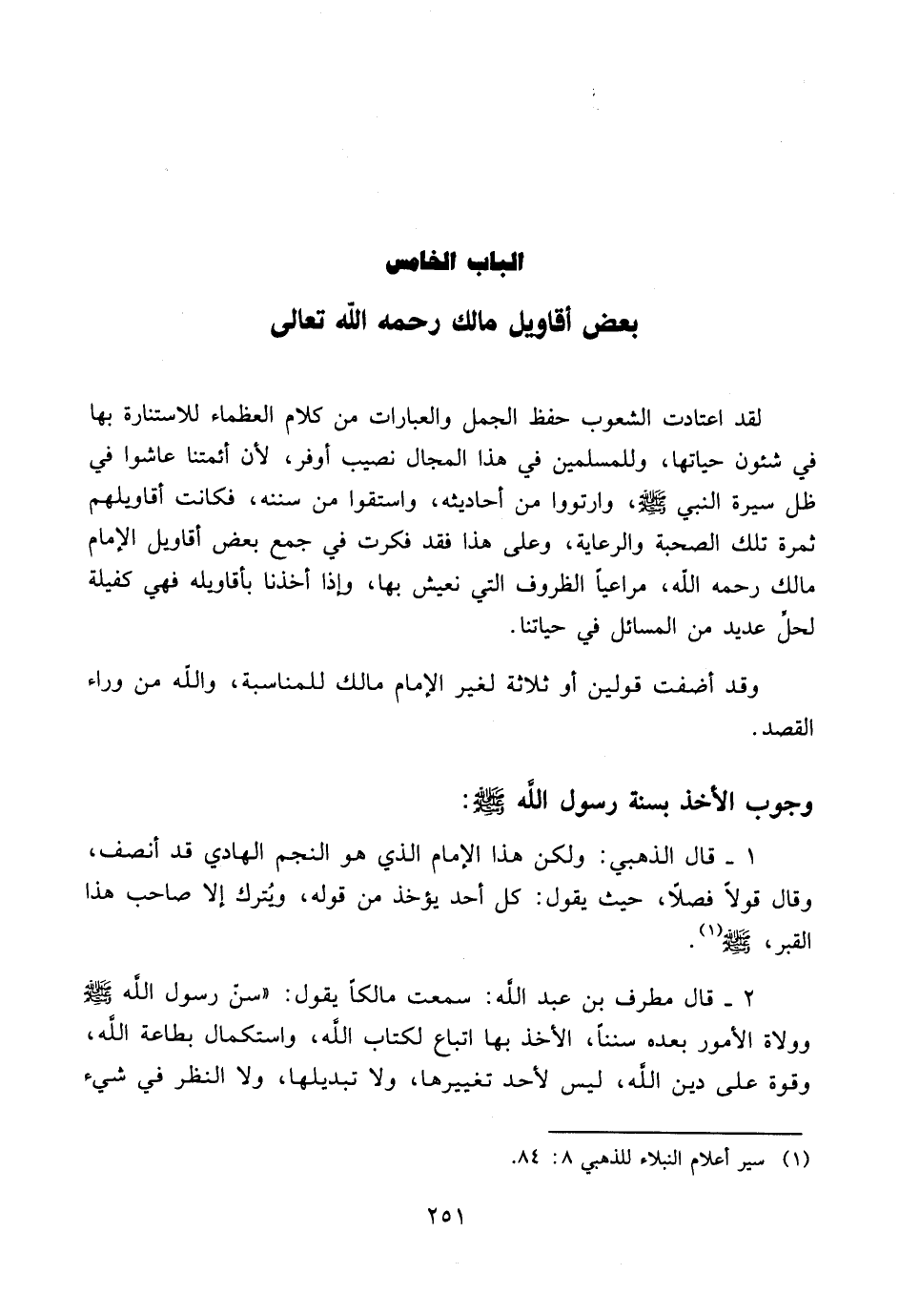 ٢ - قال مطرف بن عبد اللَّه: سمعت مالكاً يقول: «سنّ رسول اللَّه صلى الله عليه وسلم وولاة الأمور بعده سنناً، الأخذ بها اتباع لكتاب اللَّه، واستكمال بطاعة اللَّه، وقوة على دين اللَّه، ليس لأحد تغييرها، ولا تبديلها، ولا النظر في شيء