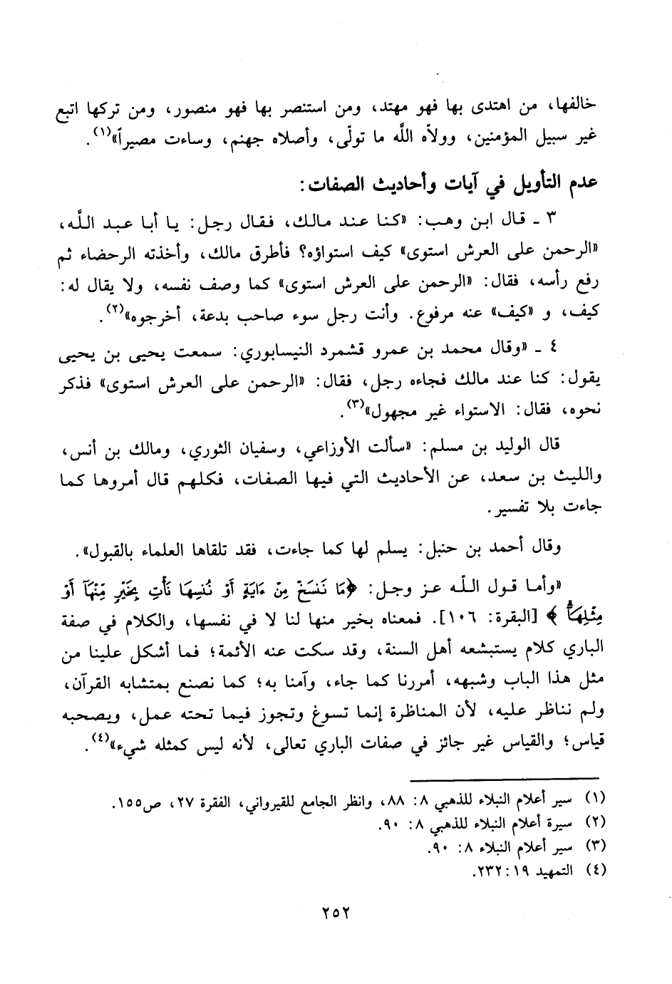 قال الوليد بن مسلم: «سألت الأوزاعي، وسفيان الثوري، ومالك بن أنس، والليث بن سعد، عن الأحاديث التي فيها الصفات، فكلهم قال أمروها كما جاءت بلا تفسير.