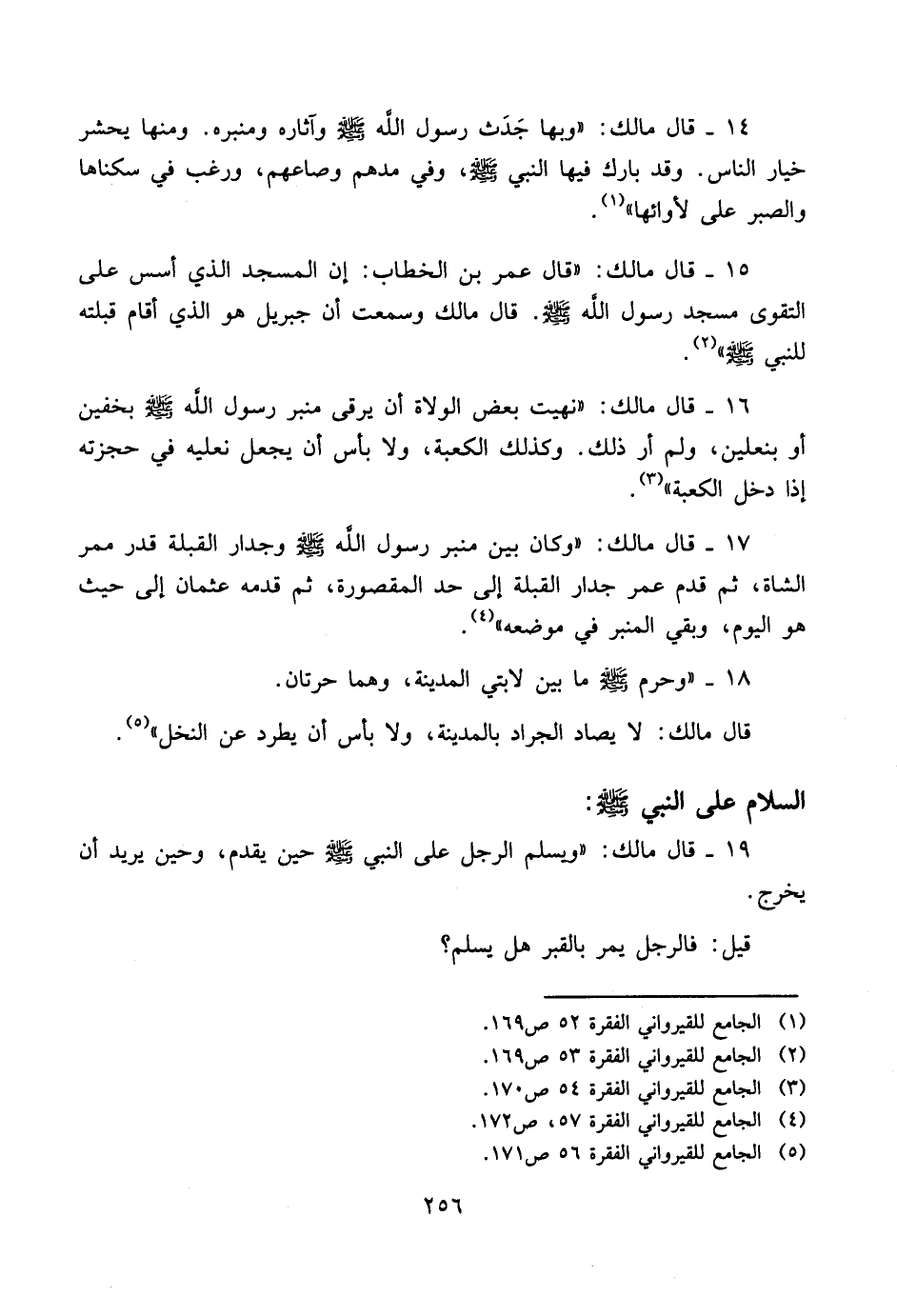 ١٤ - قال مالك: «وبها جَدَث رسول اللَّه صلى الله عليه وسلم وآثاره ومنبره. ومنها يحشر خيار الناس. وقد بارك فيها النبي صلى الله عليه وسلم، وفي مدهم وصاعهم، ورغب في سكناها والصبر على لأوائها».