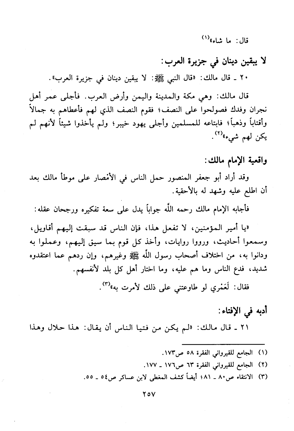 ٢٠ - قال مالك: «قال النبي صلى الله عليه وسلم: لا يبقين دينان في جزيرة العرب».