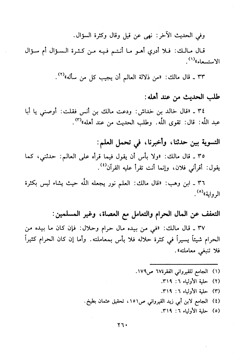٣٤ - «قال خالد بن خداش: ودعت مالك بن أنس فقلت: أوصني يا أبا عبد اللَّه: قال: تقوى اللَّه. وطلب الحديث من عند أهله».