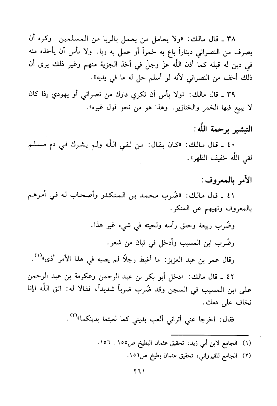 ٤١ - قال مالك: «ضُرب محمد بن المنكدر وأصحاب له في أمرهم بالمعروف ونهيهم عن المنكر.