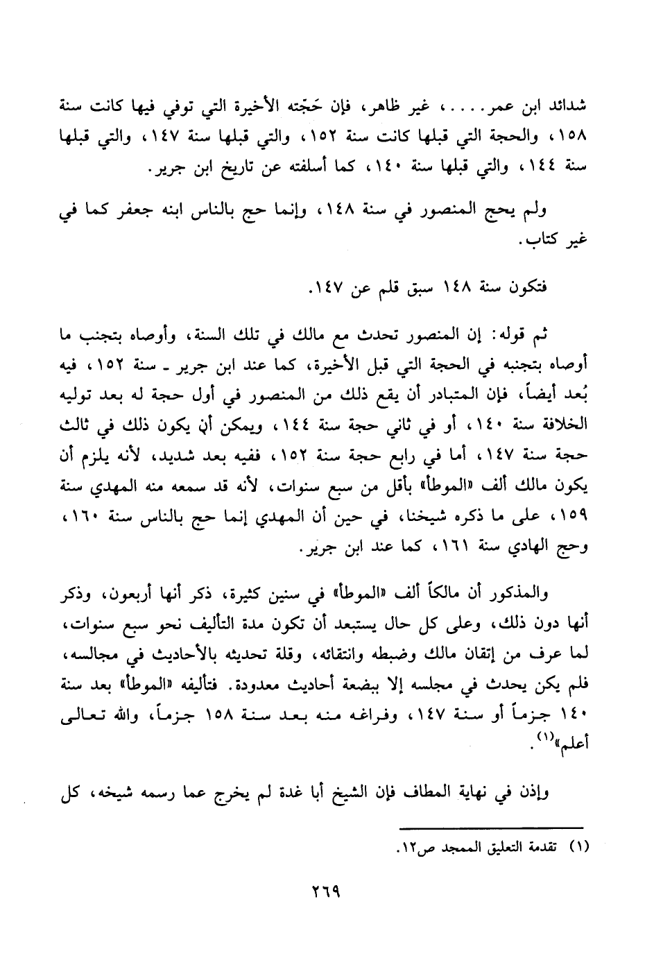 ثم قوله: إن المنصور تحدث مع مالك في تلك السنة، وأوصاه بتجنب ما أوصاه بتجنبه في الحجة التي قبل الأخيرة، كما عند ابن جرير - سنة ١٥٢، فيه بُعد أيضاً، فإن المتبادر أن يقع ذلك من المنصور في أول حجة له بعد توليه الخلافة سنة ١٤٠، أو في ثاني حجة سنة ١٤٤، ويمكن أن يكون ذلك في ثالث حجة سنة ١٤٧، أما في رابع حجة سنة ١٥٢، ففيه بعد شديد، لأنه يلزم أن يكون مالك ألف «الموطأ» بأقل من سبع سنوات، لأنه قد سمعه منه المهدي سنة ١٥٩، على ما ذكره شيخنا، في حين أن المهدي إنما حج بالناس سنة ١٦٠، وحج الهادي سنة ١٦١، كما عند ابن جرير.