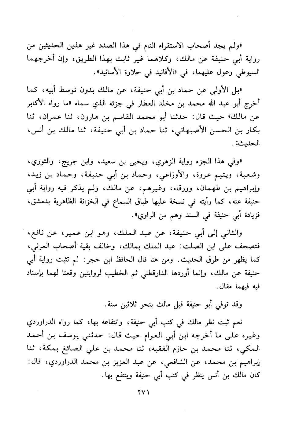 «ولم يجد أصحاب الاستقراء التام في هذا الصدد غير هذين الحديثين من رواية أبي حنيفة عن مالك، وكلاهما غير ثابت بهذا الطريق، وإن أخرجهما السيوطي وعول عليهما، في «الأفانيد في حلاوة الأسانيد».