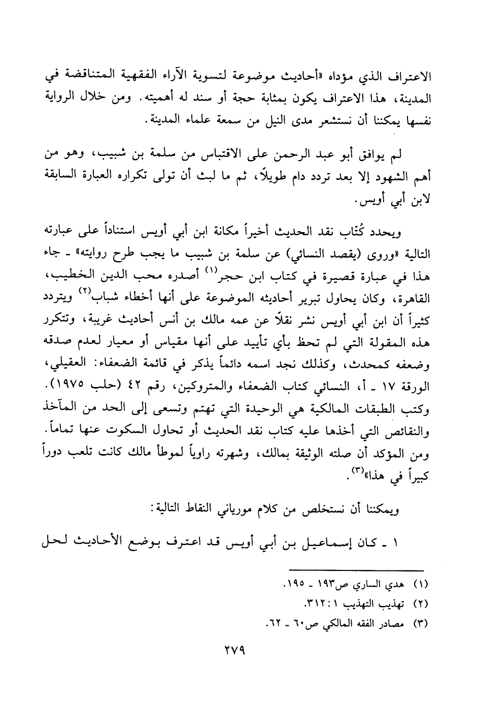 الاعتراف الذي مؤداه «أحاديث موضوعة لتسوية الآراء الفقهية المتناقضة في المدينة، هذا الاعتراف يكون بمثابة حجة أو سند له أهميته. ومن خلال الرواية نفسها يمكننا أن نستشعر مدى النيل من سمعة علماء المدينة.