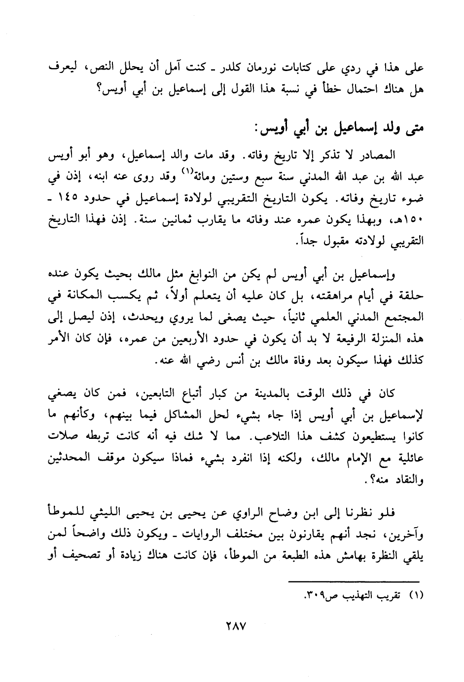 على هذا في ردي على كتابات نورمان كلدر - كنت آمل أن يحلل النص، ليعرف هل هناك احتمال خطأ في نسبة هذا القول إلى إسماعيل بن أبي أويس؟