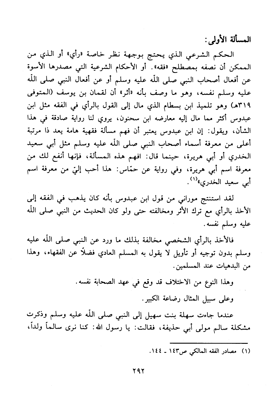 الحكم الشرعي الذي يحتج بوجهة نظر خاصة «رأي» أو الذي من الممكن أن نصفه بمصطلح «فقه». أو الأحكام الشرعية التي مصدرها الأسوة عن أفعال أصحاب النبي صلى الله عليه وسلم أو عن أفعال النبي صلى الله عليه وسلم نفسه، وهو ما وصف بأنه «أثر» أن لقمان بن يوسف (المتوفى ٣١٩هـ) وهو تلميذ ابن بسطام الذي مال إلى القول بالرأي في الفقه مثل ابن عبدوس أكثر مما مال إليه معارضه ابن سحنون، يروي لنا رواية صادقة في هذا الشأن، ويقول: إن ابن عبدوس يعتبر أن فهم مسألة فقهية هامة يعد ذا مرتبة أعلى من معرفة أسماء أصحاب النبي صلى