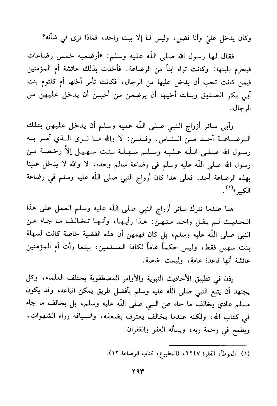 وأبى سائر أزواج النبي صلى الله عليه وسلم أن يدخل عليهن بتلك الرضاعة أحد من الناس. وقلن: لا والله ما نرى الذي أمر به رسول الله صلى الله عليه وسلم سهلة بنت سهيل إلَّا رخصة من رسول الله صلى الله عليه وسلم في رضاعة سالم وحده، لا والله لا يدخل علينا بهذه الرضاعة أحد. فعلى هذا كان أزواج النبي صلى الله عليه وسلم في رضاعة الكبير».