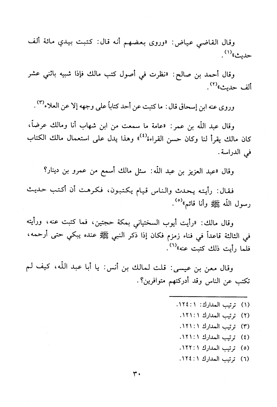 وقال معن بن عيسى: قلت لمالك بن أنس: يا أبا عبد الله، كيف لم تكتب عن الناس وقد أدركتهم متوافرين؟.