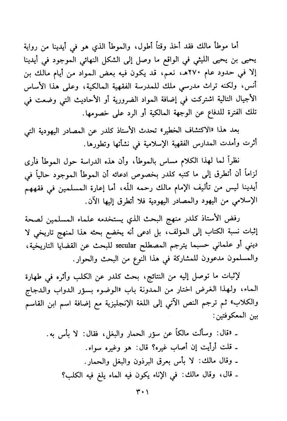 لإثبات ما توصل إليه من النتائج، بحث كلدر عن الكلب وأثره في طهارة الماء، ولهذا الغرض اختار من المدونة باب «الوضوء بسؤر الدواب والدجاج والكلاب» ثم ترجم النص الآتي إلى اللغة الإنجليزية مع إضافة اسم ابن القاسم بين المعكوفتين: