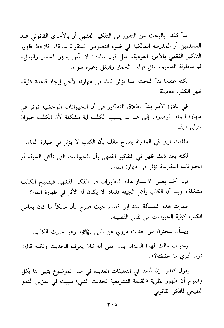 بدأ كلدر بالبحث عن التطور في التفكير الفقهي أو بالأحرى القانوني عند المسلمين أو المدرسة المالكية في ضوء النصوص المنقولة سابقاً، فلاحظ ظهور التفكير الفقهي بالأمور الفردية، مثل قول مالك: لا بأس بسؤر الحمار والبغل، ثم محاولة التعميم، مثل قوله: الحمار والبغل وغيره سواء.