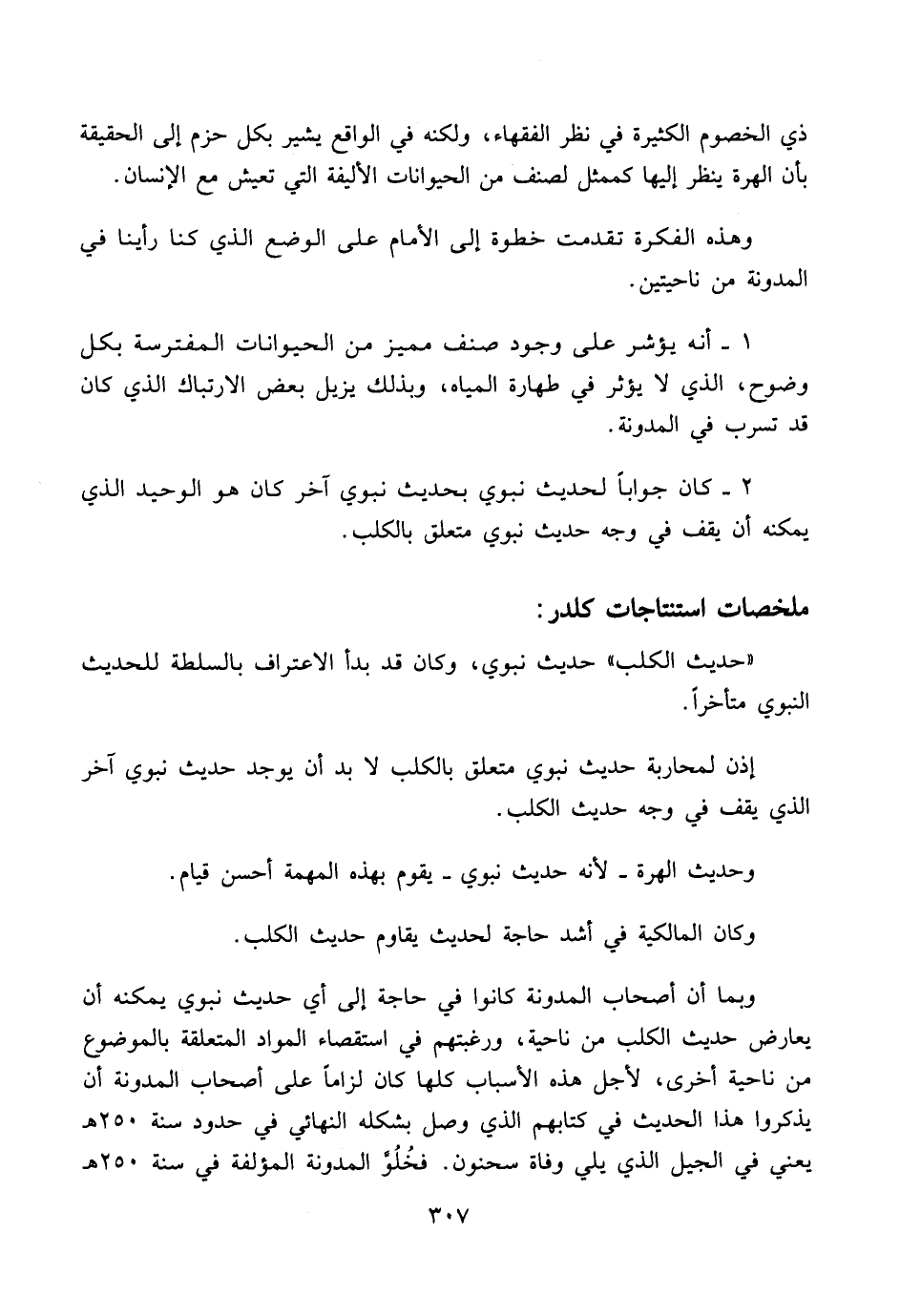 وبما أن أصحاب المدونة كانوا في حاجة إلى أي حديث نبوي يمكنه أن يعارض حديث الكلب من ناحية، ورغبتهم في استقصاء المواد المتعلقة بالموضوع من ناحية أخرى، لأجل هذه الأسباب كلها كان لزاماً على أصحاب المدونة أن يذكروا هذا الحديث في كتابهم الذي وصل بشكله النهائي في حدود سنة ٢٥٠هـ يعني في الجيل الذي يلي وفاة سحنون. فخُلُوَّ المدونة المؤلفة في سنة ٢٥٠هـ