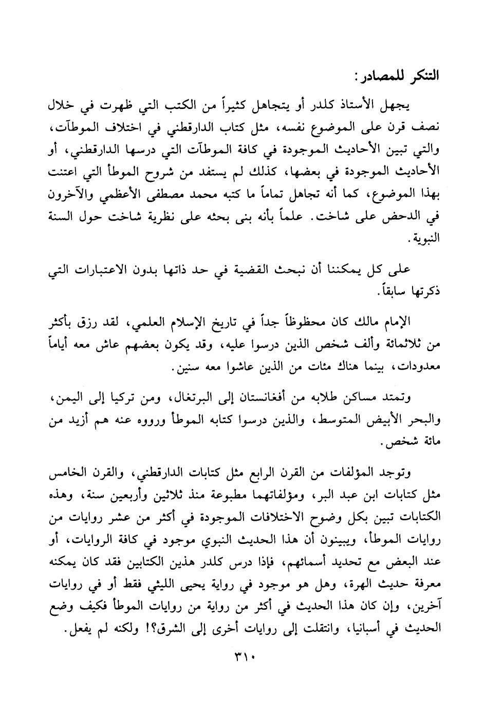 وتوجد المؤلفات من القرن الرابع مثل كتابات الدارقطني، والقرن الخامس مثل كتابات ابن عبد البر، ومؤلفاتهما مطبوعة منذ ثلاثين وأربعين سنة، وهذه الكتابات تبين بكل وضوح الاختلافات الموجودة في أكثر من عشر روايات من روايات الموطأ، ويبينون أن هذا الحديث النبوي موجود في كافة الروايات، أو عند البعض مع تحديد أسمائهم، فإذا درس كلدر هذين الكتابين فقد كان يمكنه معرفة حديث الهرة، وهل هو موجود في رواية يحيى الليثي فقط أو في روايات آخرين، وإن كان هذا الحديث في أكثر من رواية من روايات الموطأ فكيف وضع الحديث في أسبانيا، وانتقلت إلى روايات أخرى إلى الشرق؟! ولكنه لم يفعل.