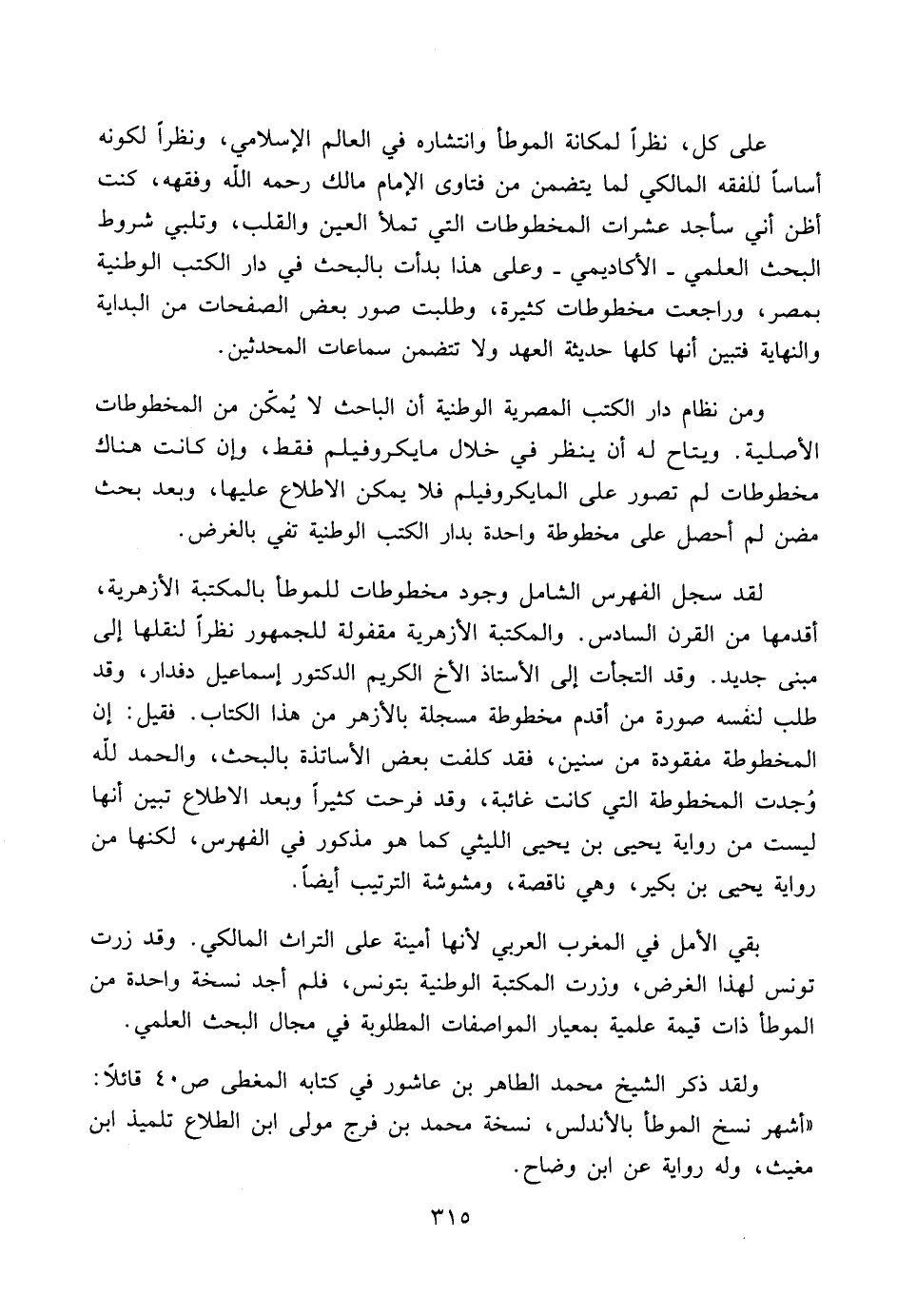على كل، نظراً لمكانة الموطأ وانتشاره في العالم الإسلامي، ونظراً لكونه أساساً للفقه المالكي لما يتضمن من فتاوى الإمام مالك رحمه الله وفقهه، كنت أظن أني سأجد عشرات المخطوطات التي تملأ العين والقلب، وتلبي شروط البحث العلمي - الأكاديمي - وعلى هذا بدأت بالبحث في دار الكتب الوطنية بمصر، وراجعت مخطوطات كثيرة، وطلبت صور بعض الصفحات من البداية والنهاية فتبين أنها كلها حديثة العهد ولا تتضمن سماعات المحدثين.