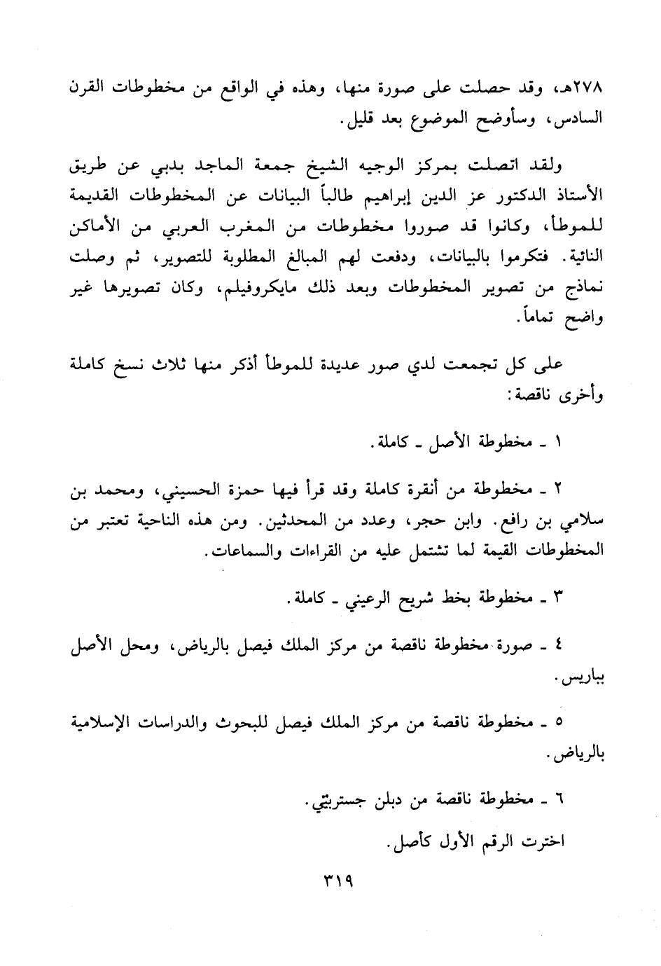 ولقد اتصلت بمركز الوجيه الشيخ جمعة الماجد بدبي عن طريق الأستاذ الدكتور عز الدين إبراهيم طالباً البيانات عن المخطوطات القديمة للموطأ، وكانوا قد صوروا مخطوطات من المغرب العربي من الأماكن النائية. فتكرموا بالبيانات، ودفعت لهم المبالغ المطلوبة للتصوير، ثم وصلت نماذج من تصوير المخطوطات وبعد ذلك مايكروفيلم، وكان تصويرها غير واضح تماماً.