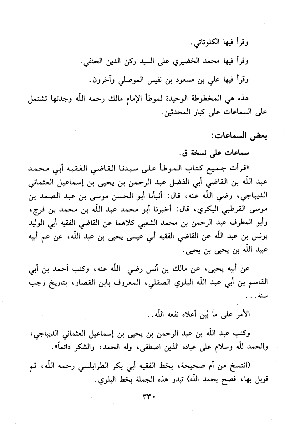 (انتسخ من أم صحيحة، بخط الفقيه أبي بكر الطرابلسي رحمه الله، ثم قوبل بها، فصح بحمد الله) تبدو هذه الجملة بخط البلوي.