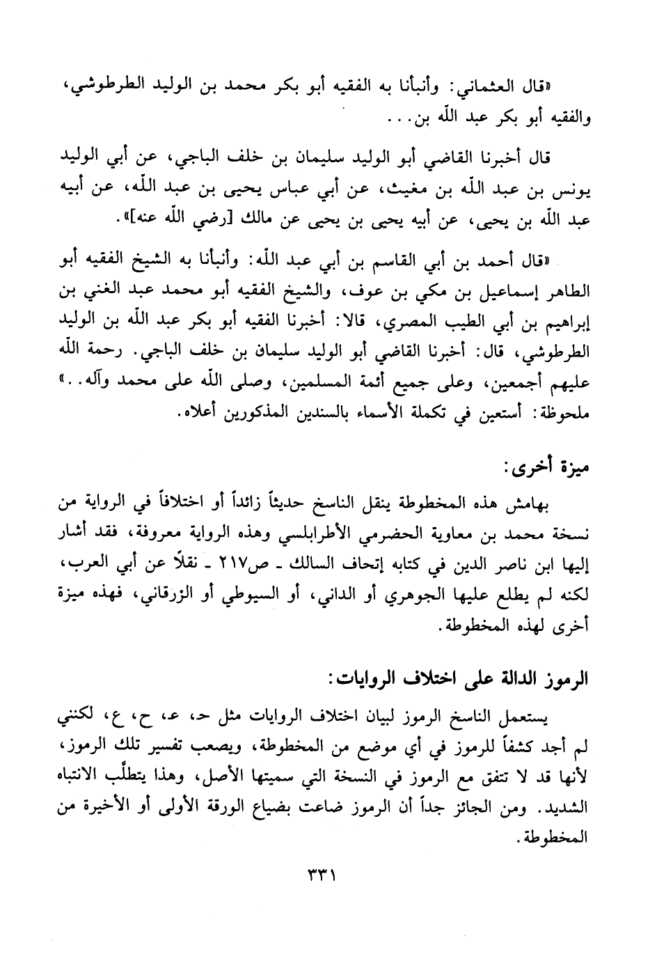 «قال أحمد بن أبي القاسم بن أبي عبد الله: وأنبأنا به الشيخ الفقيه أبو الطاهر إسماعيل بن مكي بن عوف، والشيخ الفقيه أبو محمد عبد الغني بن إبراهيم بن أبي الطيب المصري، قالا: أخبرنا الفقيه أبو بكر عبد الله بن الوليد الطرطوشي، قال: أخبرنا القاضي أبو الوليد سليمان بن خلف الباجي. رحمة الله عليهم أجمعين، وعلى جميع أئمة المسلمين، وصلى الله على محمد وآله .. » ملحوظة: أستعين في تكملة الأسماء بالسندين المذكورين أعلاه.