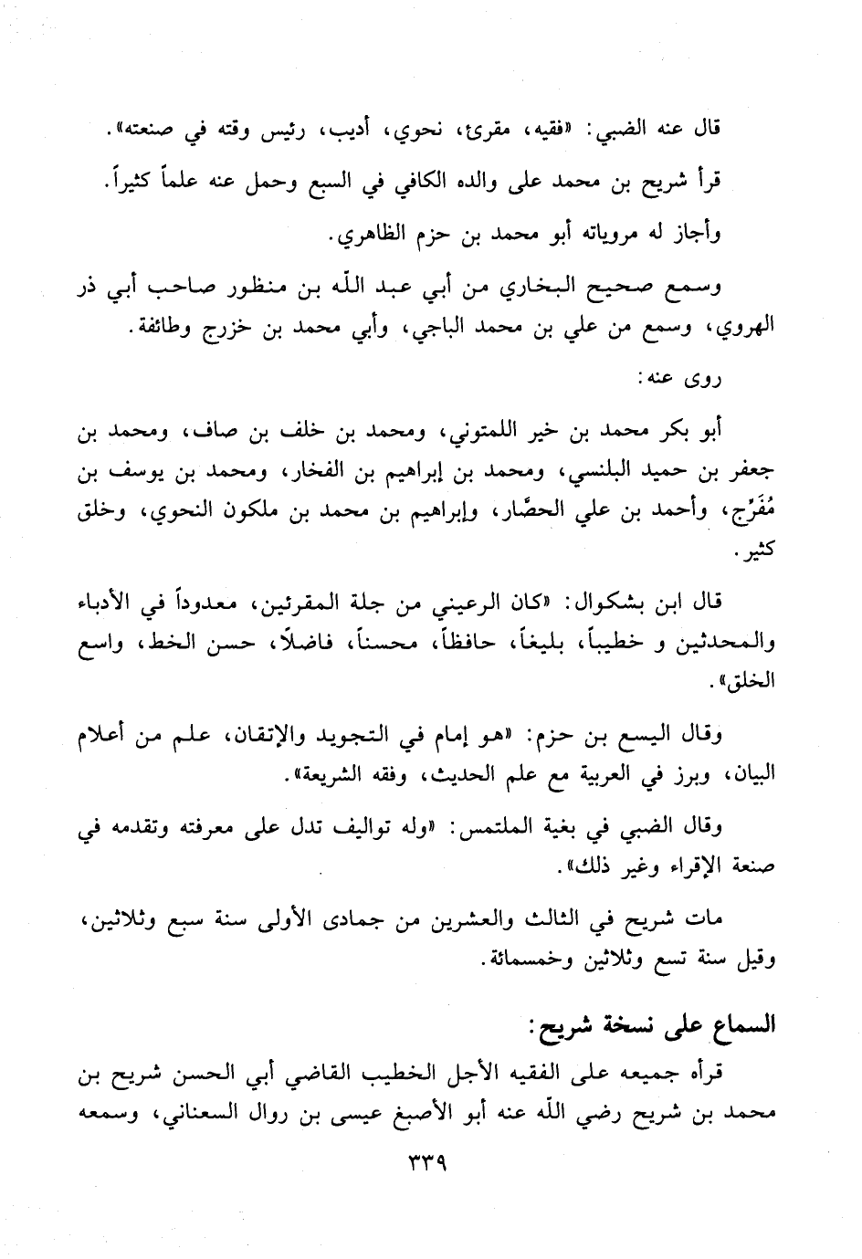 قرأه جميعه على الفقيه الأجل الخطيب القاضي أبي الحسن شريح بن محمد بن شريح رضي الله عنه أبو الأصبغ عيسى بن روال السعناني، وسمعه