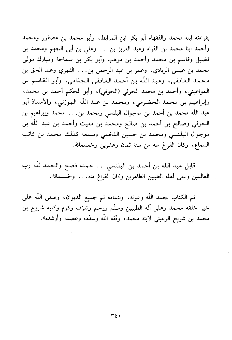 تم الكتاب بحمد الله وعونه، وبتمامه تم جميع الديوان، وصلى الله على خير خلقه محمد وعلى آله الطيبين وسلّم ورحم وشرّف وكرم وكتبه شريح بن محمد بن شريح الرعيني لابنه محمد، وفّقه الله وسدّده وعصمه وأرشده».
