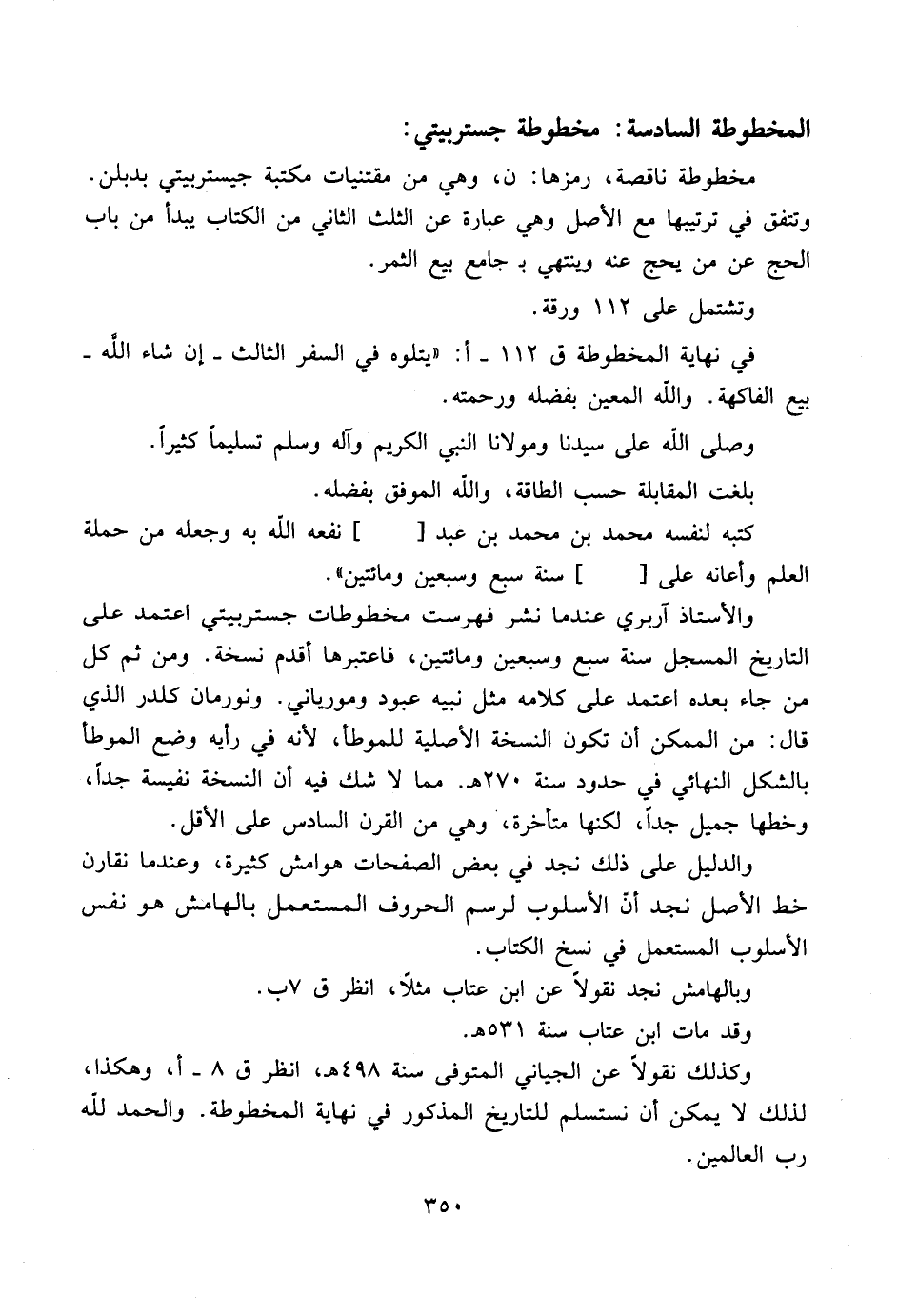 والأستاذ آربري عندما نشر فهرست مخطوطات جستربيتي اعتمد على التاريخ المسجل سنة سبع وسبعين ومائتين، فاعتبرها أقدم نسخة. ومن ثم كل من جاء بعده اعتمد على كلامه مثل نبيه عبود ومورياني. ونورمان كلدر الذي قال: من الممكن أن تكون النسخة الأصلية للموطأ، لأنه في رأيه وضع الموطأ بالشكل النهائي في حدود سنة ٢٧٠هـ. مما لا شك فيه أن النسخة نفيسة جداً، وخطها جميل جداً، لكنها متأخرة، وهي من القرن السادس على الأقل.