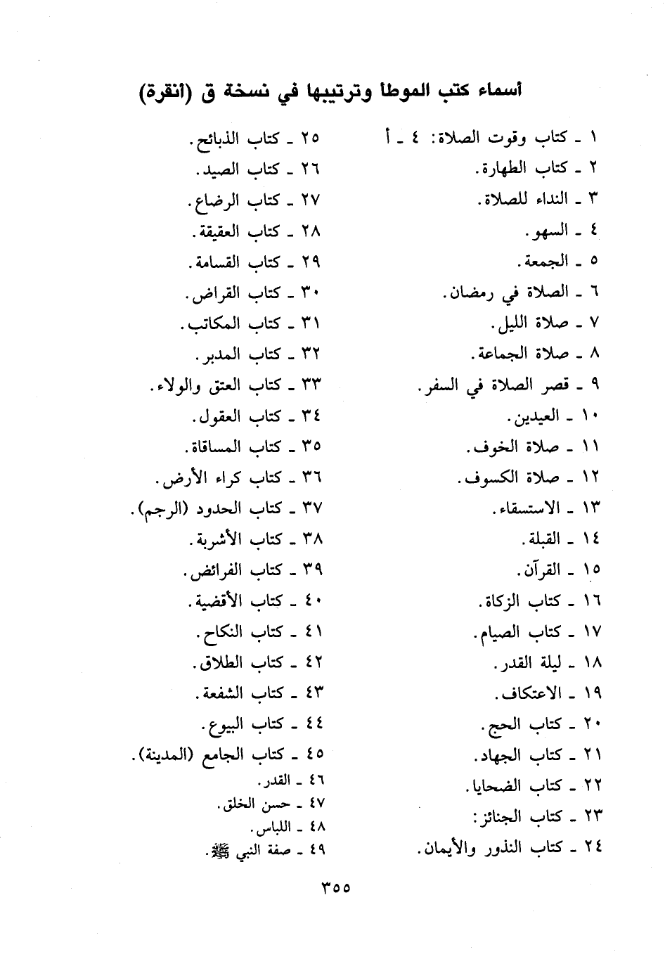 أسماء كتب الموطأ وترتيبها في نسخة ق (أنقرة)