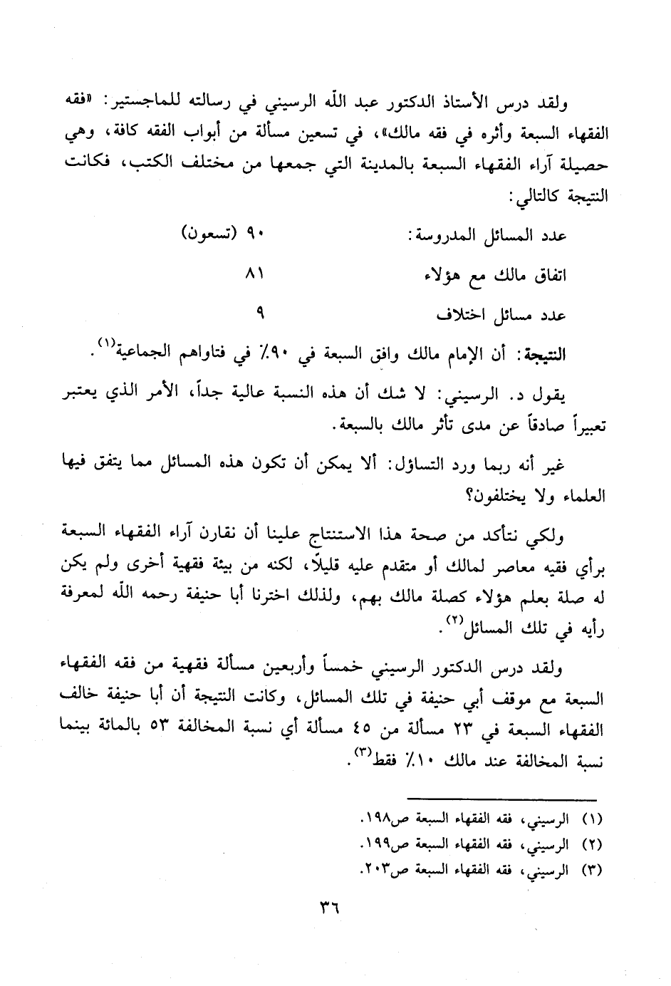 ولقد درس الدكتور الرسيني خمساً وأربعين مسألة فقهية من فقه الفقهاء السبعة مع موقف أبي حنيفة في تلك المسائل، وكانت النتيجة أن أبا حنيفة خالف الفقهاء السبعة في ٢٣ مسألة من ٤٥ مسألة أي نسبة المخالفة ٥٣ بالمائة بينما نسبة المخالفة عند مالك ١٠ % فقط.