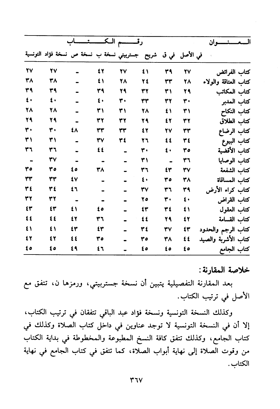 بعد المقارنة التفصيلية يتبين أن نسخة جستربيتي، ورمزها ن، تتفق مع الأصل في ترتيب الكتاب.