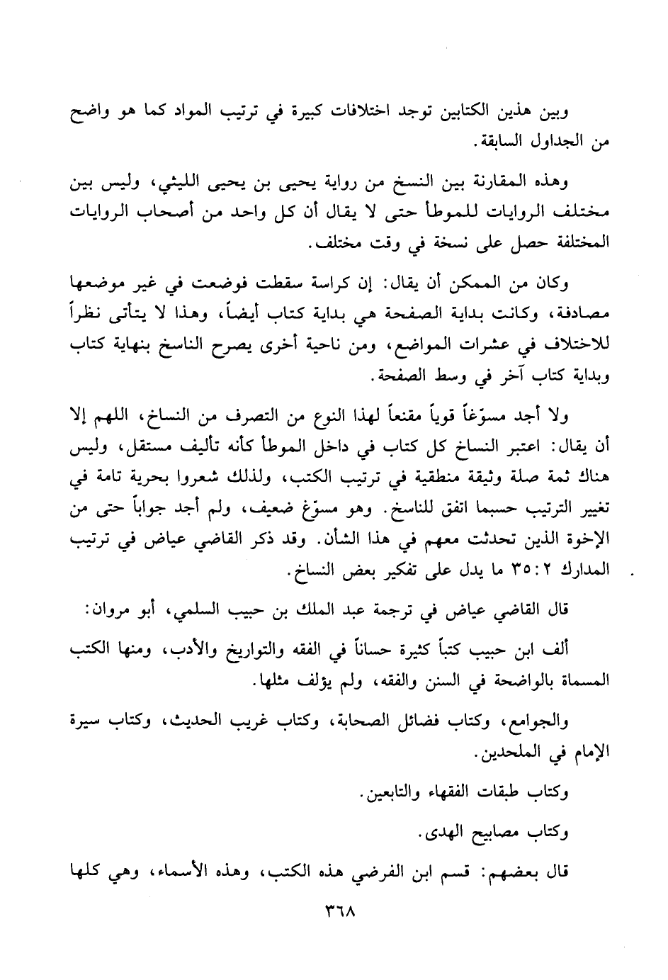 ولا أجد مسوّغاً قوياً مقنعاً لهذا النوع من التصرف من النساخ، اللهم إلا أن يقال: اعتبر النساخ كل كتاب في داخل الموطأ كأنه تأليف مستقل، وليس هناك ثمة صلة وثيقة منطقية في ترتيب الكتب، ولذلك شعروا بحرية تامة في تغيير الترتيب حسبما اتفق للناسخ. وهو مسوّغ ضعيف، ولم أجد جواباً حتى من الإخوة الذين تحدثت معهم في هذا الشأن. وقد ذكر القاضي عياض في ترتيب المدارك ٢: ٣٥ ما يدل على تفكير بعض النساخ.