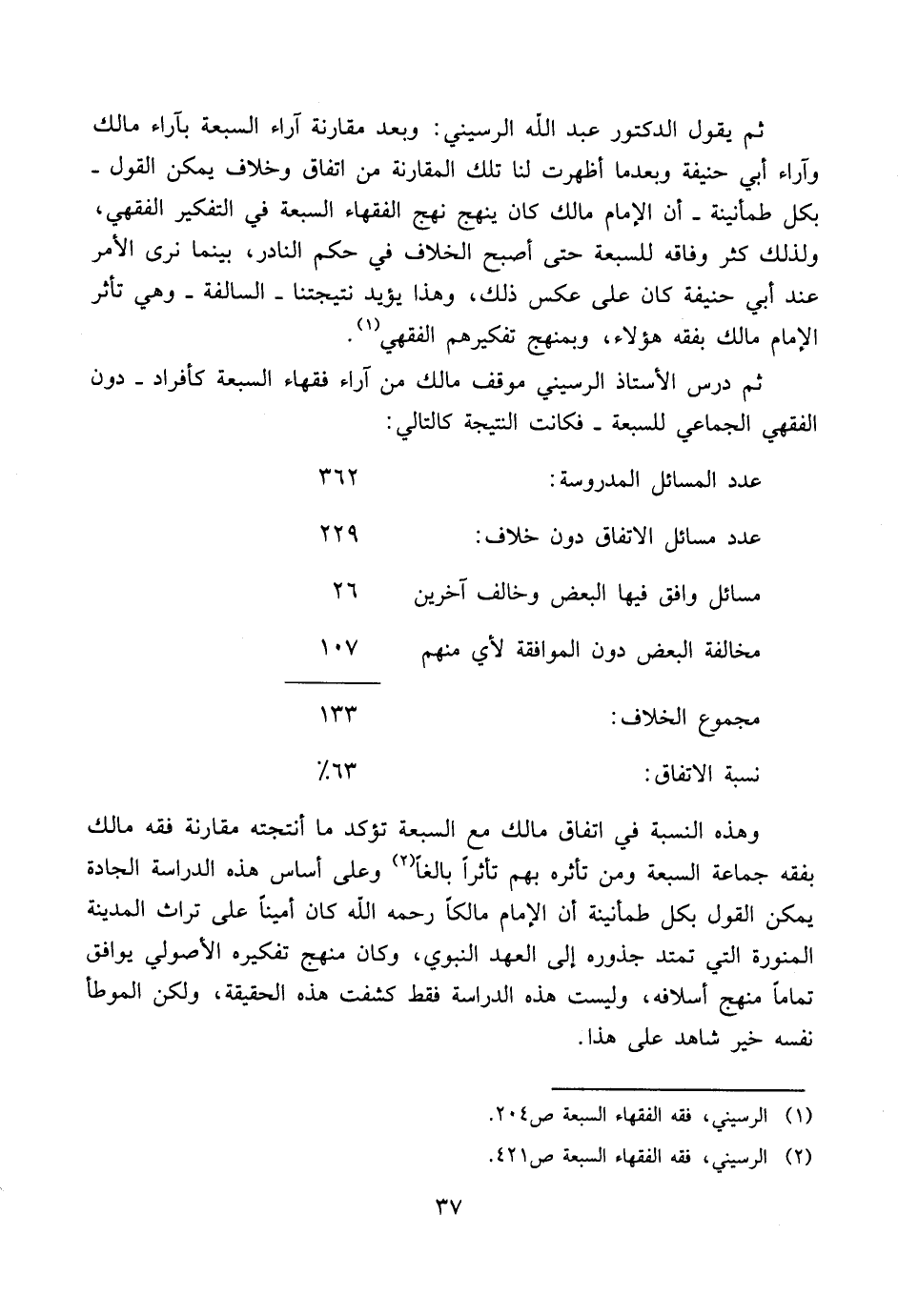 ثم يقول الدكتور عبد الله الرسيني: وبعد مقارنة آراء السبعة بآراء مالك وآراء أبي حنيفة وبعدما أظهرت لنا تلك المقارنة من اتفاق وخلاف يمكن القول - بكل طمأنينة - أن الإمام مالك كان ينهج نهج الفقهاء السبعة في التفكير الفقهي، ولذلك كثر وفاقه للسبعة حتى أصبح الخلاف في حكم النادر، بينما نرى الأمر عند أبي حنيفة كان على عكس ذلك، وهذا يؤيد نتيجتنا - السالفة - وهي تأثر الإمام مالك بفقه هؤلاء، وبمنهج تفكيرهم الفقهي.
