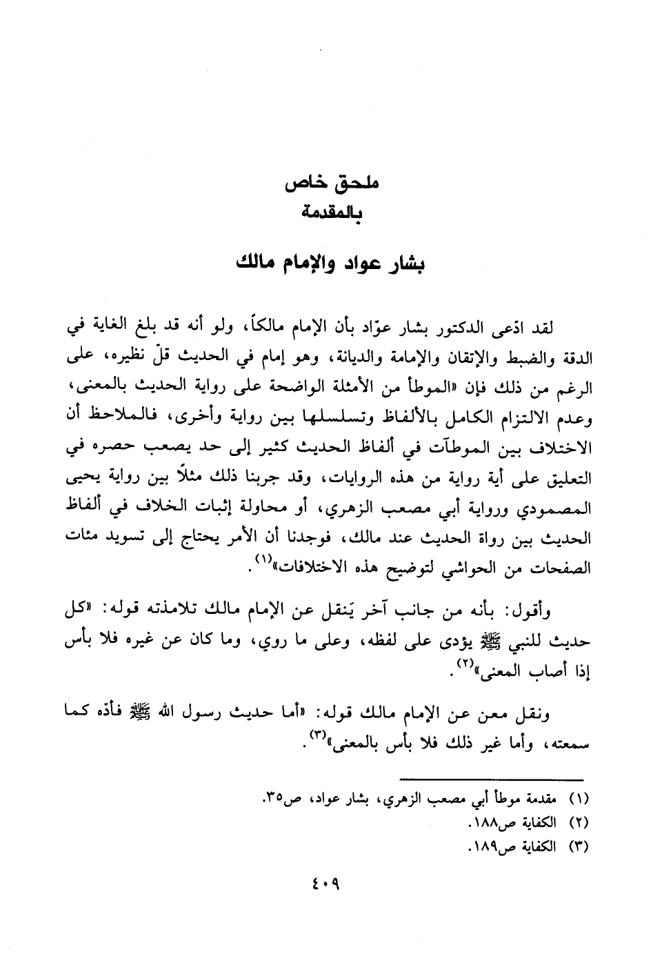 لقد ادّعى الدكتور بشار عوّاد بأن الإمام مالكاً، ولو أنه قد بلغ الغاية في الدقة والضبط والإتقان والإمامة والديانة، وهو إمام في الحديث قلّ نظيره، على الرغم من ذلك فإن «الموطأ من الأمثلة الواضحة على رواية الحديث بالمعنى، وعدم الالتزام الكامل بالألفاظ وتسلسلها بين رواية وأخرى، فالملاحظ أن الاختلاف بين الموطآت في ألفاظ الحديث كثير إلى حد يصعب حصره في التعليق على أية رواية من هذه الروايات، وقد جربنا ذلك مثلاً بين رواية يحيى المصمودي ورواية أبي مصعب الزهري، أو محاولة إثبات الخلاف في ألفاظ الحديث بين رواة الحديث عند مالك، فوجدنا أن الأمر يحتاج إلى تسويد مئات الصفحات من الحواشي لتوضيح هذه الاختلافات».