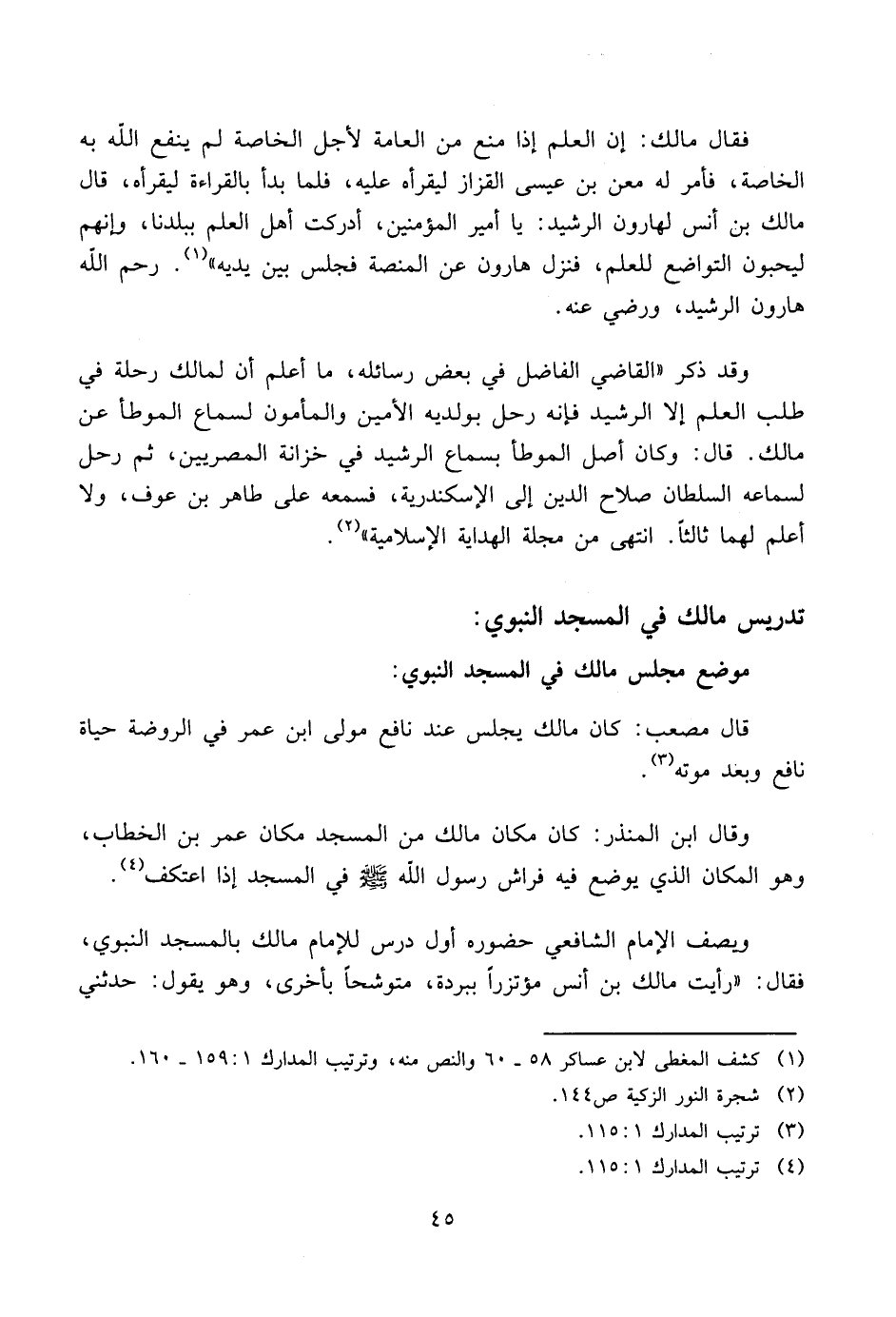 فقال مالك: إن العلم إذا منع من العامة لأجل الخاصة لم ينفع الله به الخاصة، فأمر له معن بن عيسى القزاز ليقرأه عليه، فلما بدأ بالقراءة ليقرأه، قال مالك بن أنس لهارون الرشيد: يا أمير المؤمنين، أدركت أهل العلم ببلدنا، وإنهم ليحبون التواضع للعلم، فنزل هارون عن المنصة فجلس بين يديه». رحم الله هارون الرشيد، ورضي عنه.