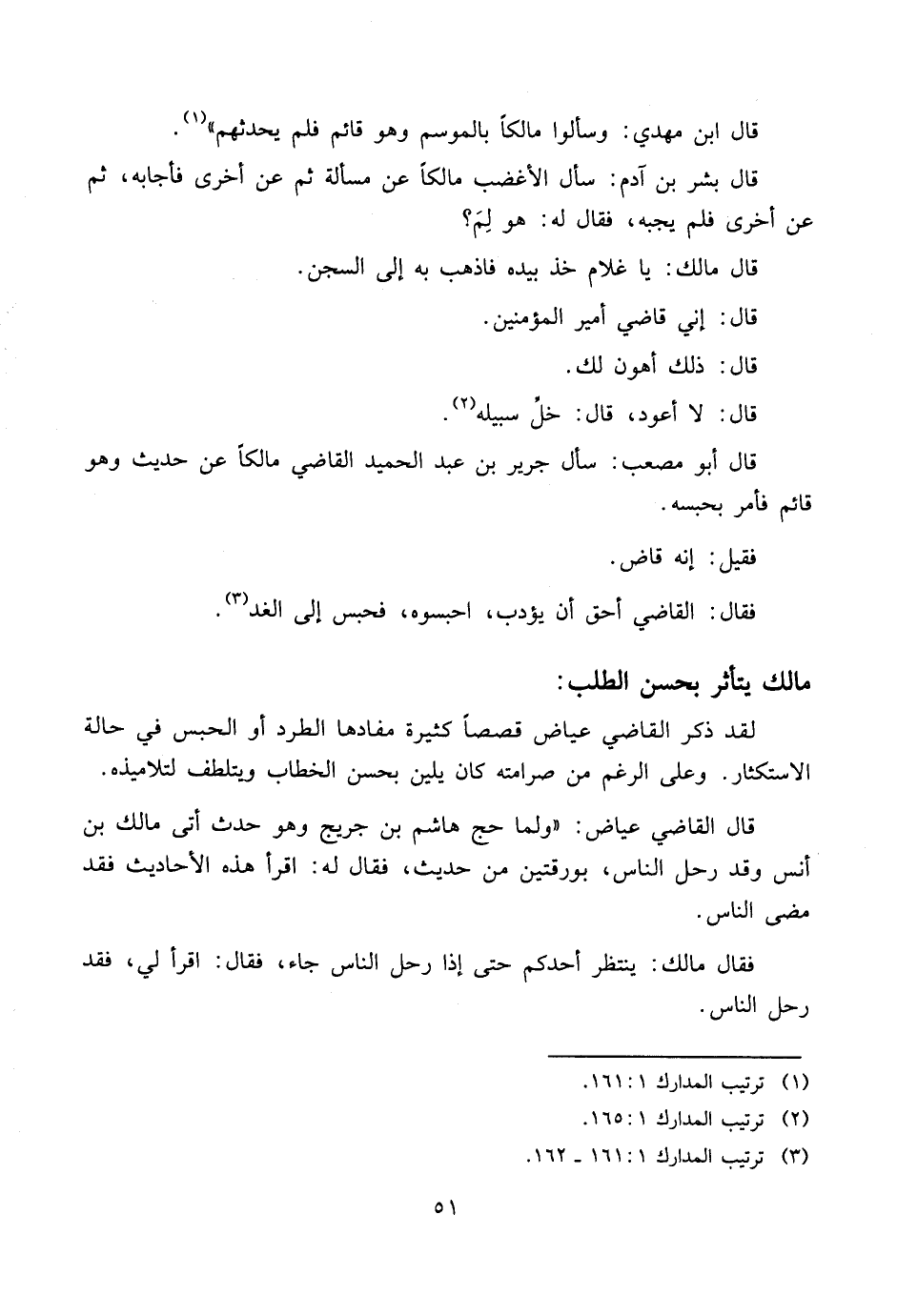 قال أبو مصعب: سأل جرير بن عبد الحميد القاضي مالكاً عن حديث وهو قائم فأمر بحبسه.