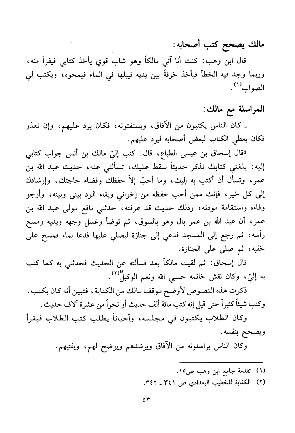 «قال إسحاق بن عيسى الطباع، قال: كتب إليّ مالك بن أنس جواب كتابي إليه: بلغني كتابك تذكر حديثاً سقط عليك، تسألني عنه، حديث عبد الله بن عمر، وتسأل أن أكتب به إليك، وما أحبّ إلّا حفظك وقضاء حاجتك، وإرشادك إلى كل خير، فإنك ممن أحب حفظه من إخواني وبقاء الود بيني وبينه، وأرجو وفاءه واستقامة مودته، وذلك حديث قد عرفته، حدثني نافع مولى عبد الله بن عمر، أن عبد الله بن عمر بال وهو بالسوق، ثم توضأ وغسل وجهه ويديه ومسح رأسه، ثم رجع إلى المسجد فدعي إلى جنازة ليصلي عليها فدعا بماء فمسح على خفيه، ثم صلى على الجنازة.