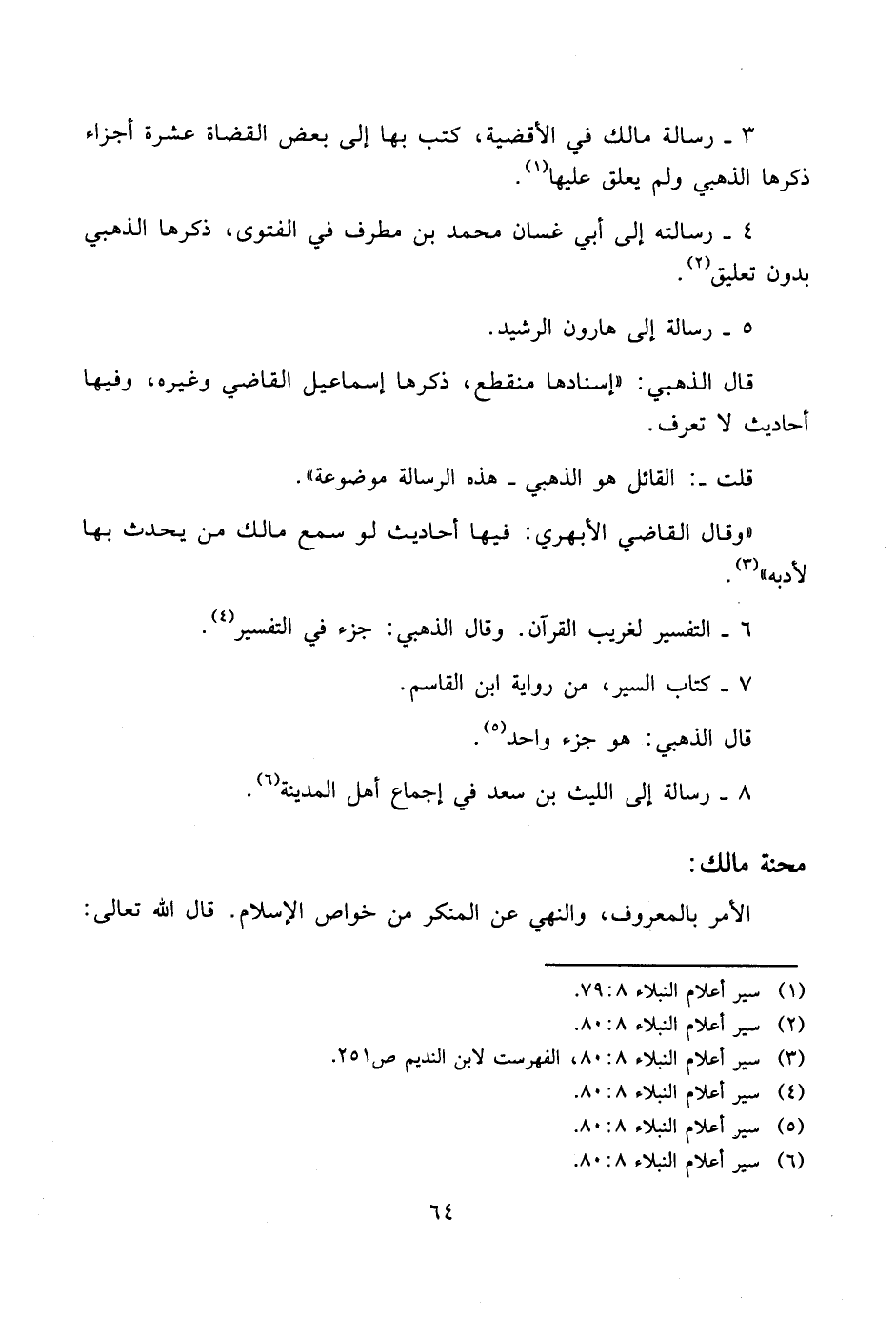٣ - رسالة مالك في الأقضية، كتب بها إلى بعض القضاة عشرة أجزاء ذكرها الذهبي ولم يعلق عليها.