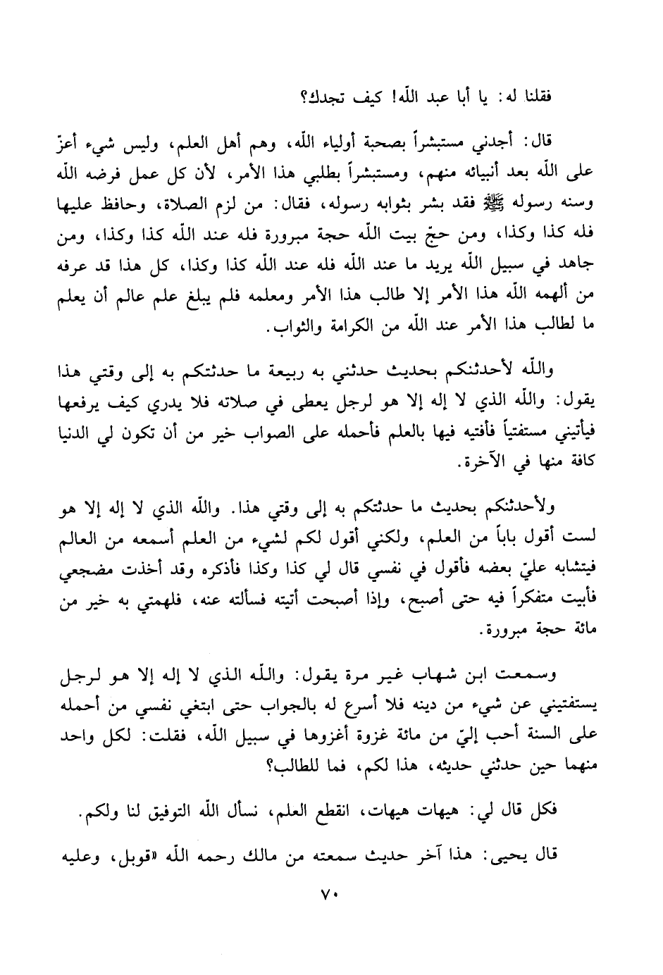 ولأحدثنكم بحديث ما حدثتكم به إلى وقتي هذا. والله الذي لا إله إلا هو لست أقول باباً من العلم، ولكني أقول لكم لشيء من العلم أسمعه من العالم فيتشابه عليّ بعضه فأقول في نفسي قال لي كذا وكذا فأذكره وقد أخذت مضجعي فأبيت متفكراً فيه حتى أصبح، وإذا أصبحت أتيته فسألته عنه، فلهمتي به خير من مائة حجة مبرورة.