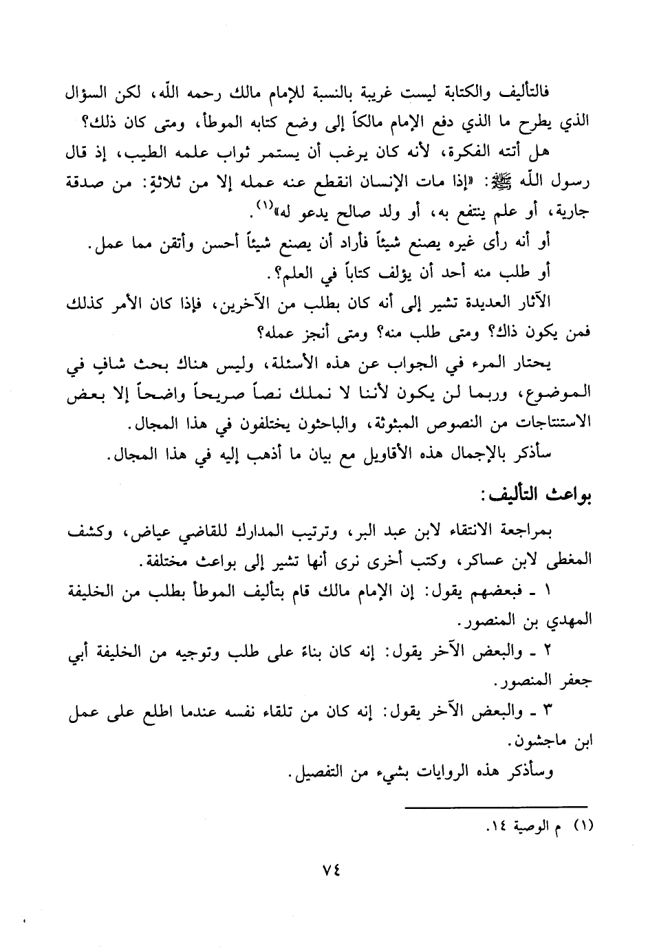 ١ - فبعضهم يقول: إن الإمام مالك قام بتأليف الموطأ بطلب من الخليفة المهدي بن المنصور.