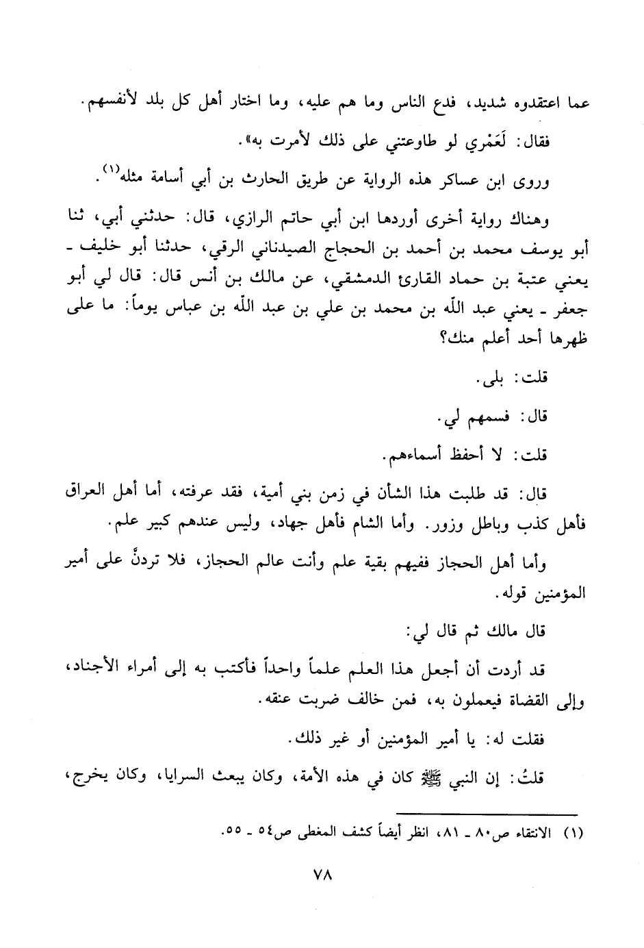 «وذكر الزبير بن بكار، قال: نا يحيى بن مسكين ومحمد بن مسلمة، قالا: سمعنا مالكاً يذكر دخوله على أبي جعفر، وقوله في إنساخ كتبه في العلم، وحمل الناس عليها: