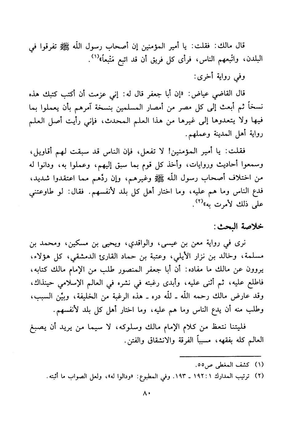 بن حماد القارئ الدمشقي، كل هؤلاء، يروون عن مالك ما مفاده: أن أبا جعفر المنصور طلب من الإمام مالك كتابه، فاطلع عليه، ثم أثنى عليه، وأبدى رغبته في نشره في العالم الإسلامي حينذاك، وقد عارض مالك رحمه الله - لله دره - هذه الرغبة من الخليفة، وبيَّن السبب، وطلب منه أن يدع الناس وما هم عليه، وما اختار أهل كل بلد لأنفسهم.