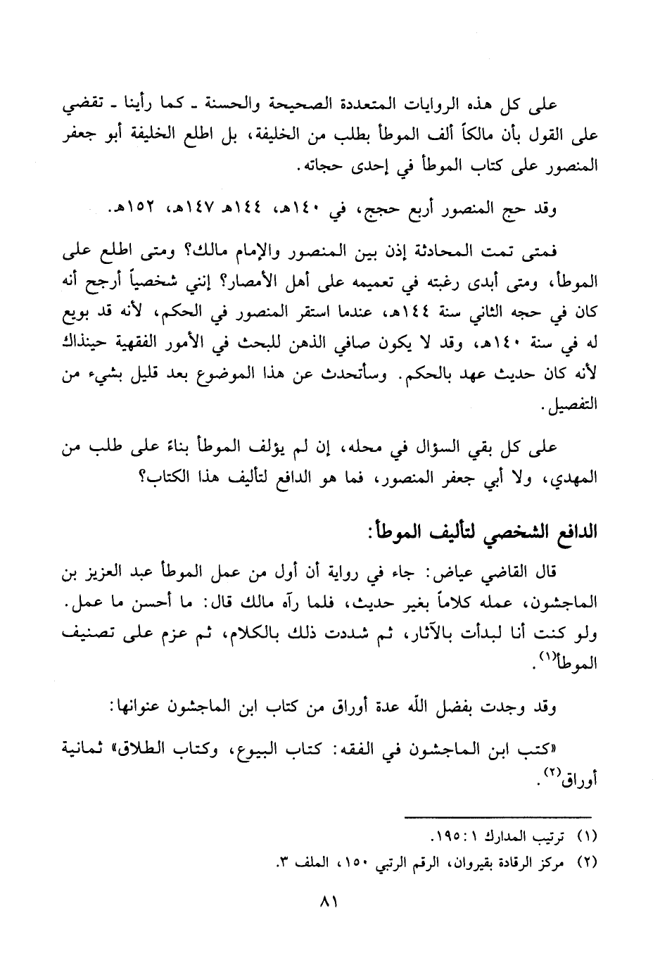 فمتى تمت المحادثة إذن بين المنصور والإمام مالك؟ ومتى اطلع على الموطأ، ومتى أبدى رغبته في تعميمه على أهل الأمصار؟ إنني شخصياً أرجح أنه كان في حجه الثاني سنة ١٤٤هـ، عندما استقر المنصور في الحكم، لأنه قد بويع له في سنة ١٤٠هـ، وقد لا يكون صافي الذهن للبحث في الأمور الفقهية حينذاك لأنه كان حديث عهد بالحكم. وسأتحدث عن هذا الموضوع بعد قليل بشيء من التفصيل.