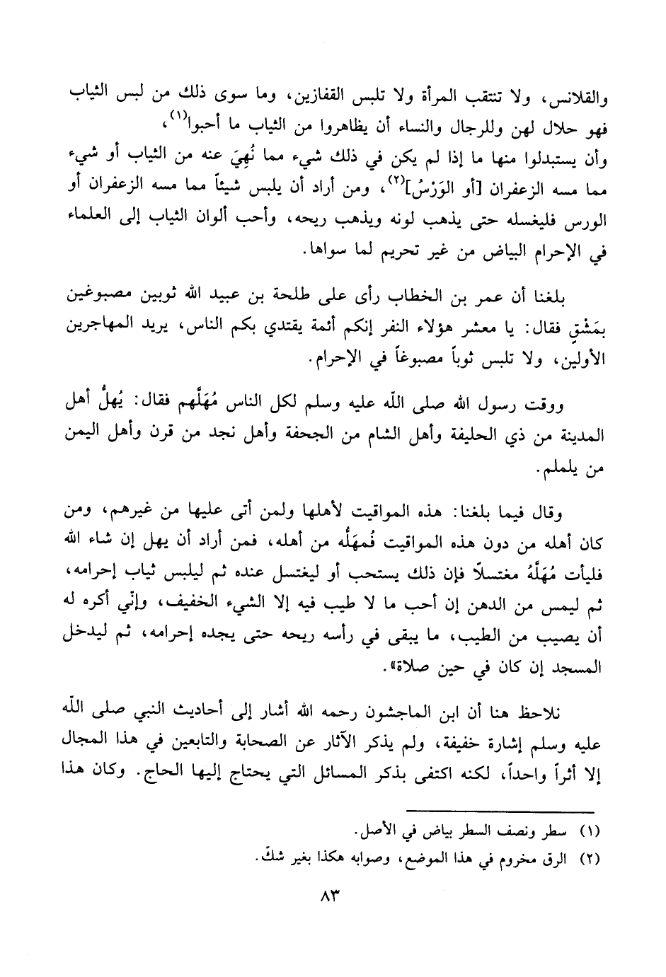 نلاحظ هنا أن ابن الماجشون رحمه الله أشار إلى أحاديث النبي صلى الله عليه وسلم إشارة خفيفة، ولم يذكر الآثار عن الصحابة والتابعين في هذا المجال إلا أثراً واحداً، لكنه اكتفى بذكر المسائل التي يحتاج إليها الحاج. وكان هذا