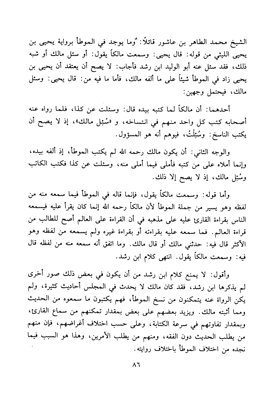 الشيخ محمد الطاهر بن عاشور قائلاً: وما يوجد في الموطأ برواية يحيى بن يحيى الليثي من قوله: قال يحيى: وسمعت مالكاً يقول: أو سئل مالك أو شبه ذلك، فقد سئل عنه أبو الوليد ابن رشد فأجاب: لا يصح أن يعتقد أن يحيى بن يحيى زاد في الموطأ شيئاً على ما ألفه مالك، فأما ما فيه من: قال يحيى: وسئل مالك، فيحتمل وجهين: